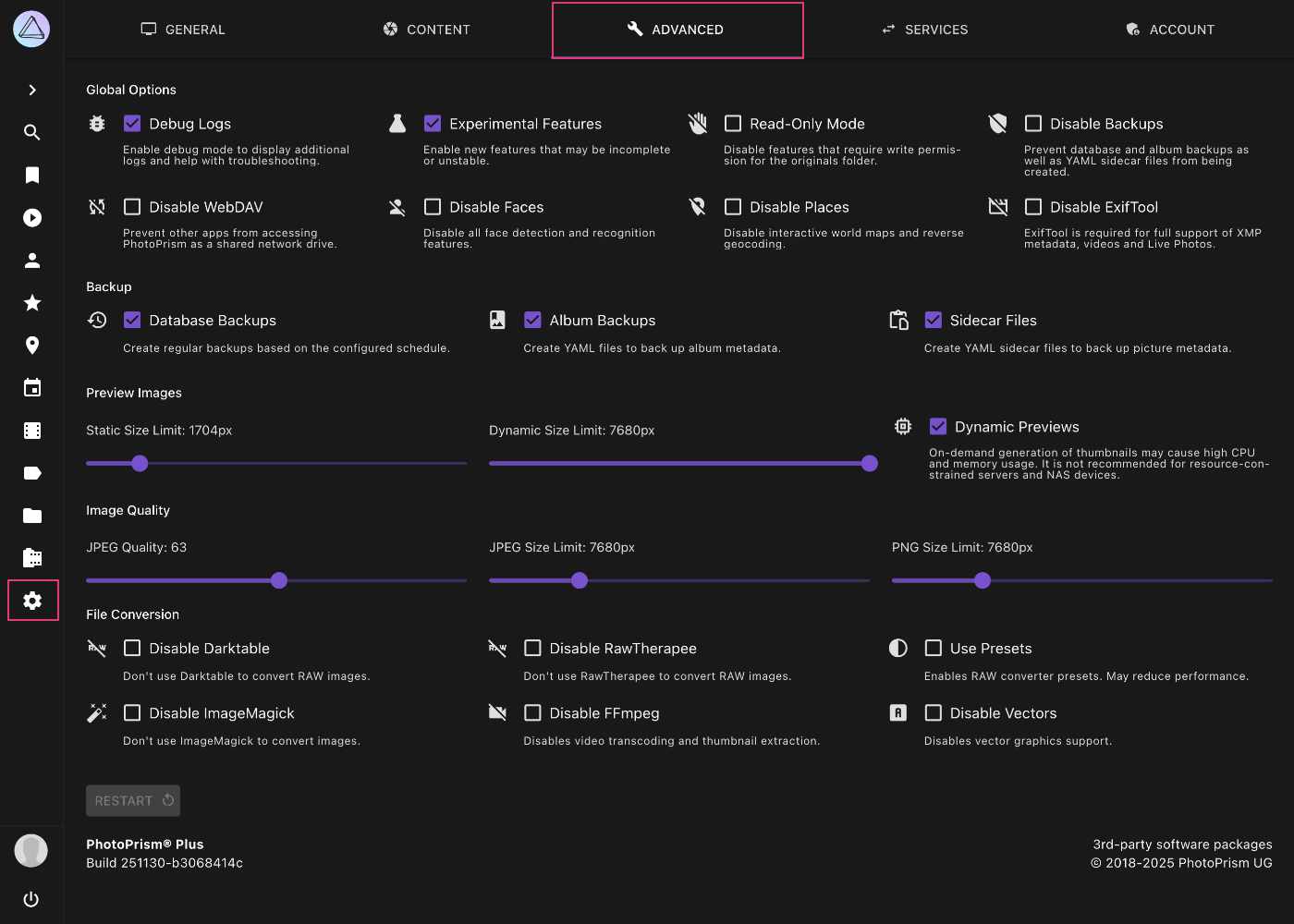 System config options such as the image quality can be changed on the advanced settings page. You can also disable specific features and enable the debug or read-only mode.