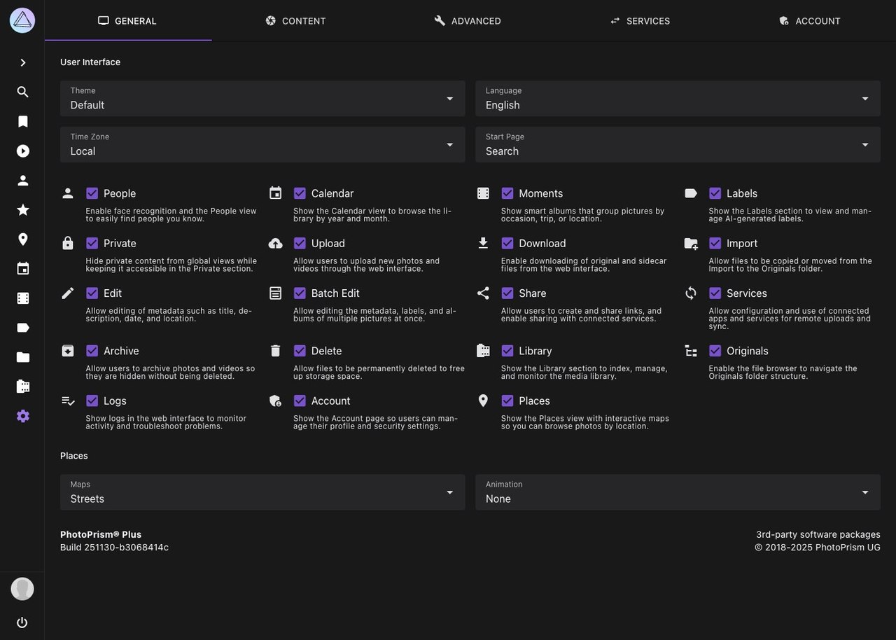 At the bottom of the General settings tab, you may choose your preferred map style and animation length for Places. PhotoPrism includes four high-resolution world maps to see where you've been, and for rediscovering long-forgotten shots.